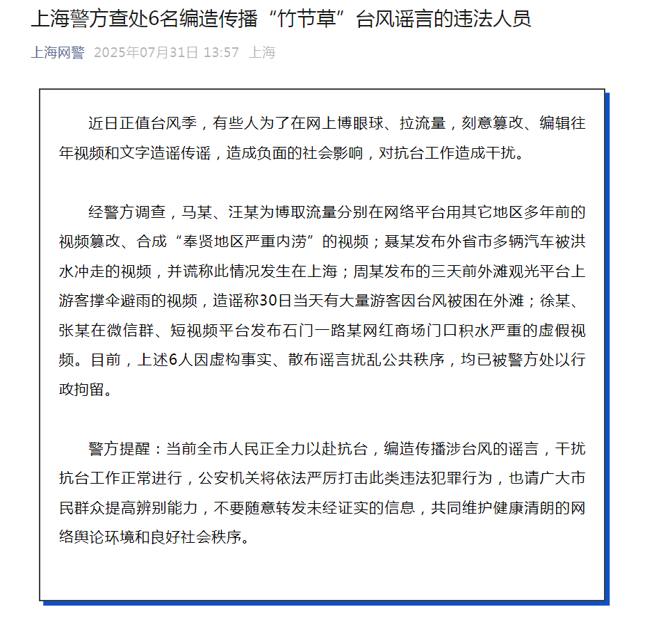 经查,马某、汪某为博取流量分别在网络平台用其它地区多年前的视频篡改、合成“上海奉贤地区严重内涝”的视频;聂某发布外省市多辆汽车被洪水冲走的视频,并谎称此情况发生在上海;周某发布的三天前外滩观光平台上游客撑伞避雨的视频,造谣称30日当天有大量游客因台风被困在外滩;徐某、张某在互联网群组、短视频平台发布上海石门一路某网红商场门口积水严重的虚假视频。目前,上述6人因虚构事实、散布谣言扰乱公共秩序,均已被警方处以行政拘留。